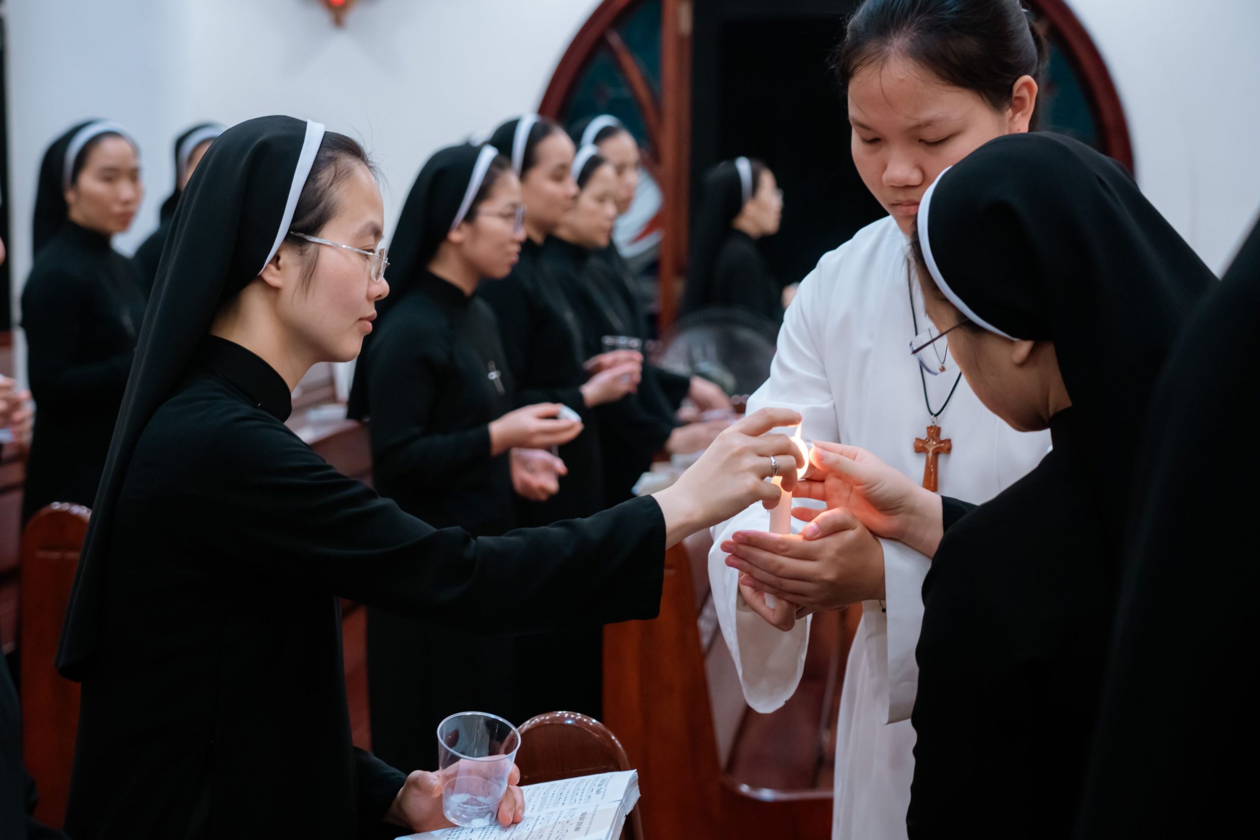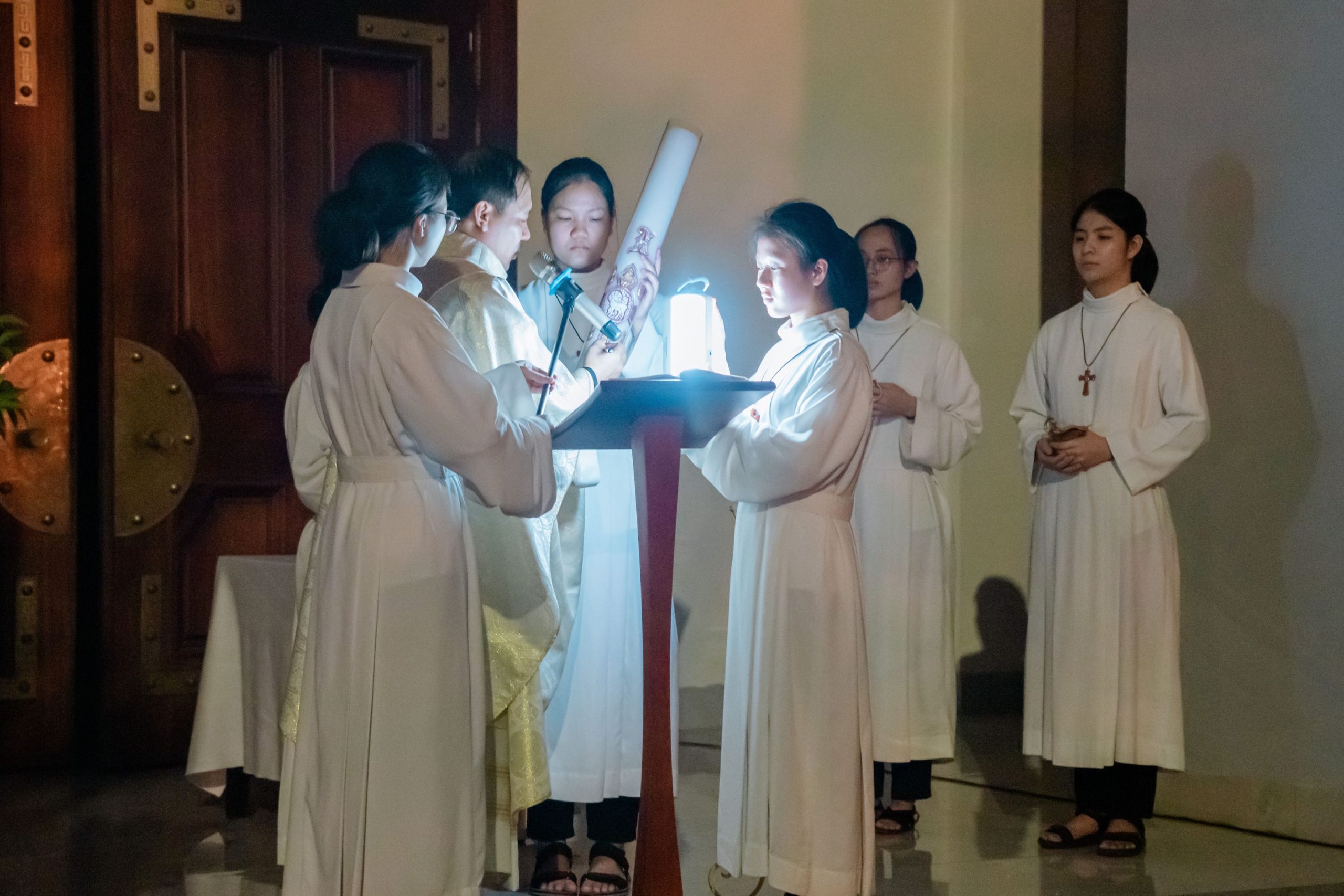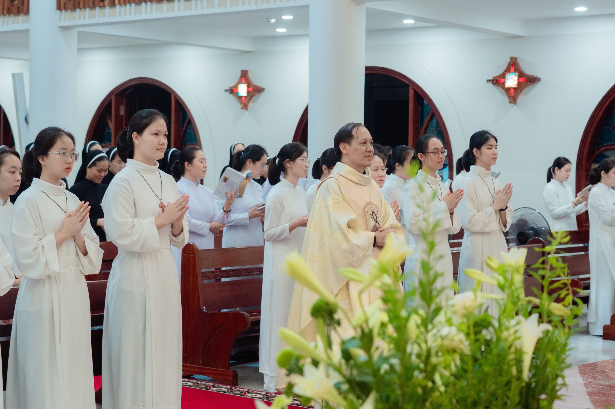 Trong bầu khí linh thiêng và trang trọng của Đêm Canh Thức Vượt Qua, vào lúc 20h00 Thứ Bảy, ngày 04/4/2026, cộng đoàn Nhà Mẹ – Dòng Mến Thánh Giá Hà Nội đã long trọng cử hành Đêm Vọng Phục Sinh – đêm thánh cao trọng nhất trong năm phụng vụ, tưởng niệm Đức Kitô từ cõi chết sống lại, đem ánh sáng và niềm hy vọng mới cho toàn thể nhân loại. Thánh lễ do Cha Tuyên úy Giuse Vũ Quang Học chủ sự, cùng với sự tham dự sốt sắng của đông đảo chị em trong cộng đoàn.