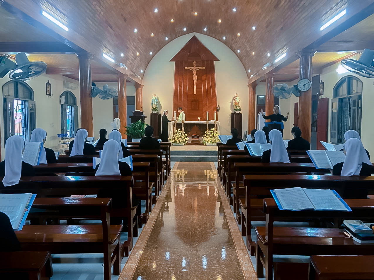 Sáng ngày 1/10/2025, cộng đoàn đã cùng nhau hiệp thông trong giờ Kinh Phụng vụ sốt sắng. Đỉnh cao của ngày mừng lễ là Thánh lễ được cử hành lúc 5h30, do Cha An-tôn Nguyễn Xuân Thắng, OFM chủ sự. Thánh lễ diễn ra trong bầu khí trang nghiêm, thánh thiêng, với sự tham dự trọn vẹn của các chị em trong cộng đoàn.