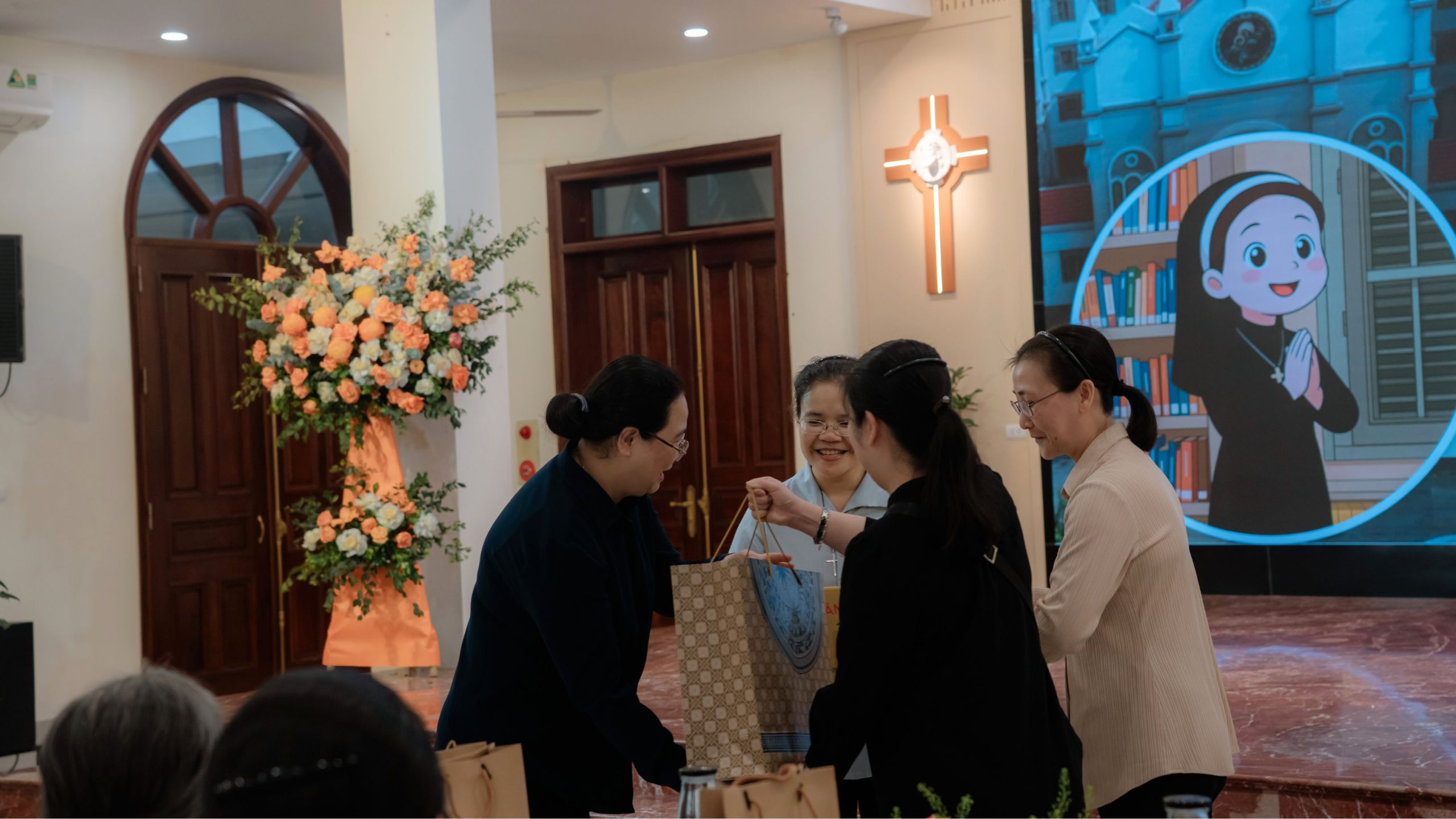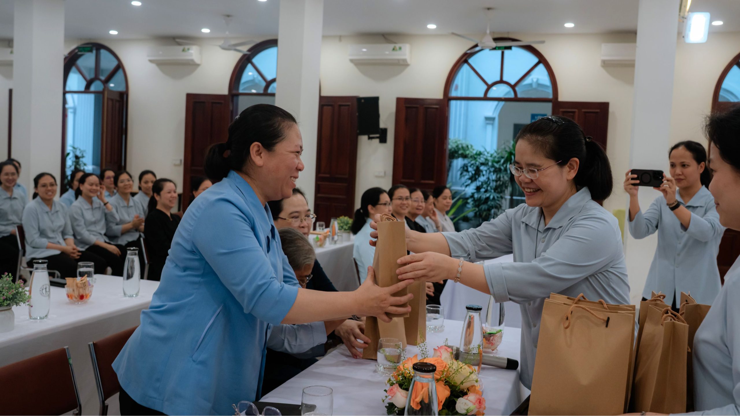 Trong tâm tình tri ân và hiệp thông, Sr. Maria Đỗ Thị Như Hoa – Tổng Phụ trách đã thay mặt chị em trong Hội dòng trao tặng quý Sơ phái đoàn những món quà lưu niệm như dấu chỉ của tình hiệp nhất và lòng quý mến.