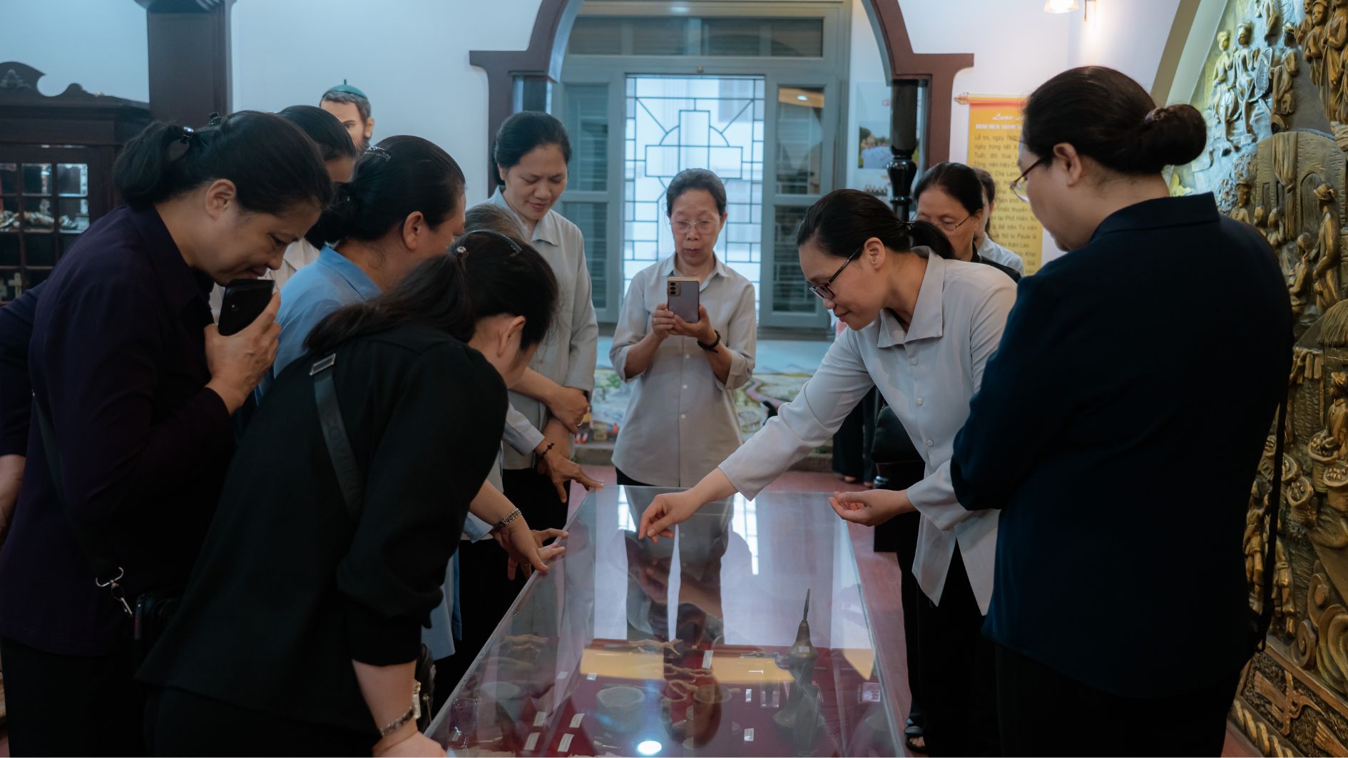 Tiếp đó, phái đoàn cũng được mời tham quan Phòng Truyền thống của Hội dòng, nơi lưu giữ những dấu ấn lịch sử và hành trình phát triển của Dòng Mến Thánh Giá Hà Nội qua bao thế hệ. Những kỷ vật, hình ảnh và tư liệu được trân trọng gìn giữ nơi đây như nhắc nhớ chị em về hành trình đức tin của các bậc tiền nhân, đồng thời khơi dậy niềm xác tín rằng linh đạo Mến Thánh Giá vẫn đang tiếp tục được gìn giữ và triển nở trong lòng Giáo hội hôm nay.