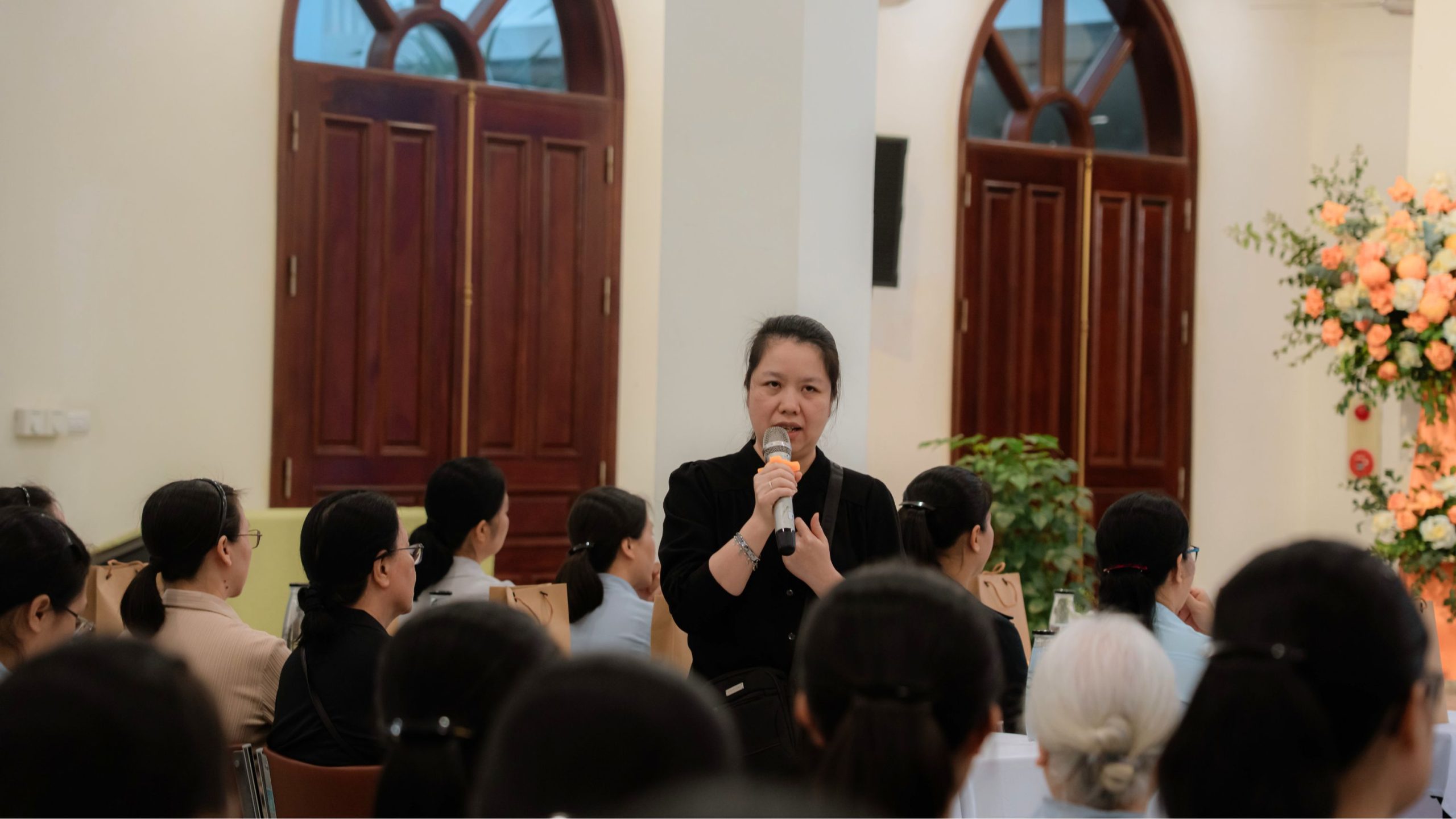 Tiếp đó, Sr. Maria Đỗ Thị Như Hoa – Tổng Phụ trách đã giới thiệu các thành phần hiện diện tại Cộng đoàn Nhà Mẹ, đồng thời chia sẻ đôi nét về đời sống và sứ mạng của Hội dòng Mến Thánh Giá Hà Nội. Trải qua dòng lịch sử với nhiều thăng trầm của thời cuộc, Hội dòng vẫn kiên trì hiện diện giữa lòng Thủ đô với tinh thần khiêm tốn, âm thầm phục vụ và trung thành với đoàn sủng Mến Thánh Giá.