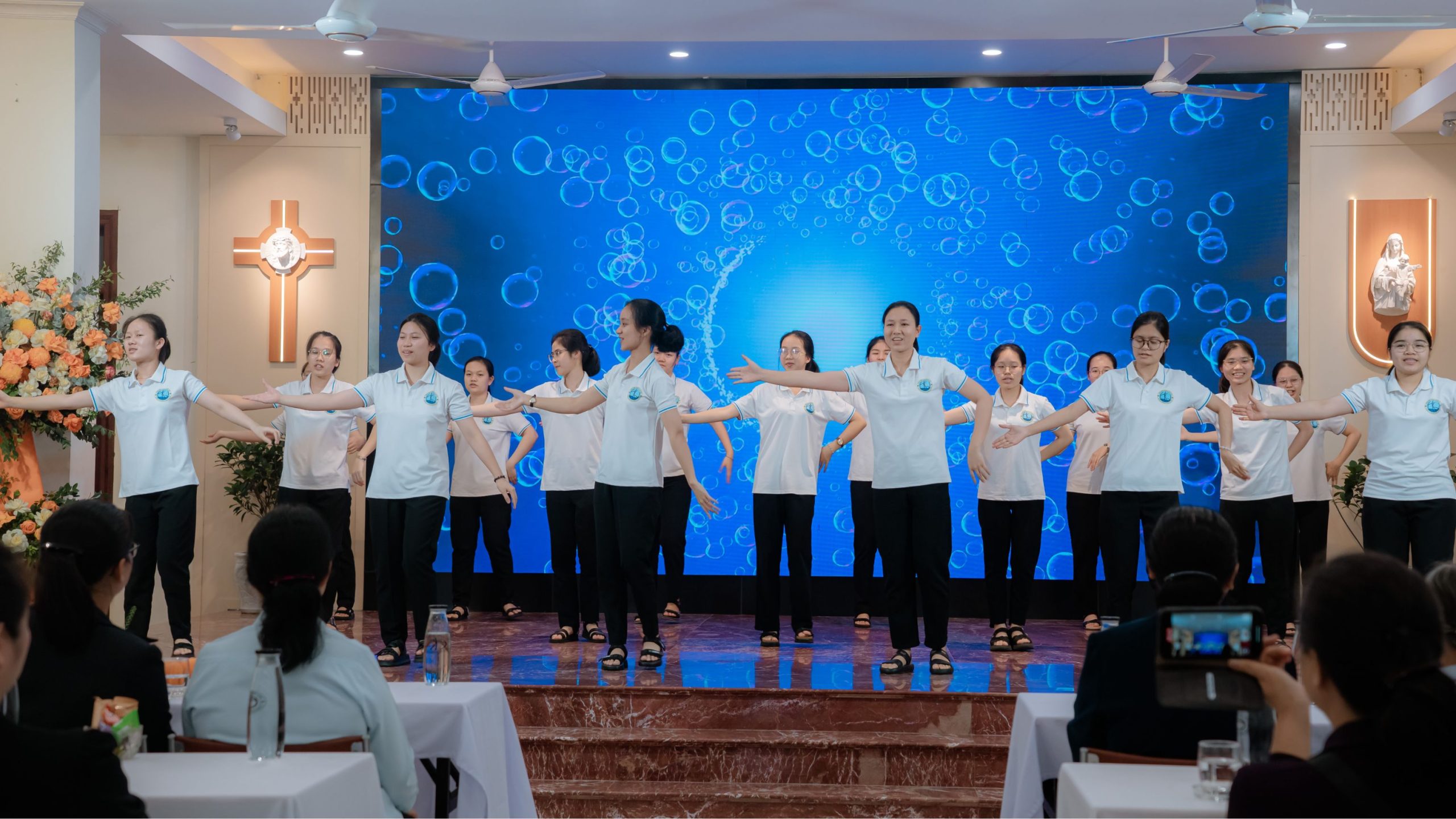 Trong niềm vui của cuộc gặp gỡ, các em Đệ tử Mầm non của Hội dòng đã biểu diễn vũ khúc “Đức Kitô đang sống”. Những bước nhảy hồn nhiên và tươi sáng của các em như một biểu tượng sống động cho sức sống của Hội dòng – một sức sống được khơi nguồn từ Đức Kitô Phục Sinh và tiếp tục được truyền trao qua các thế hệ.