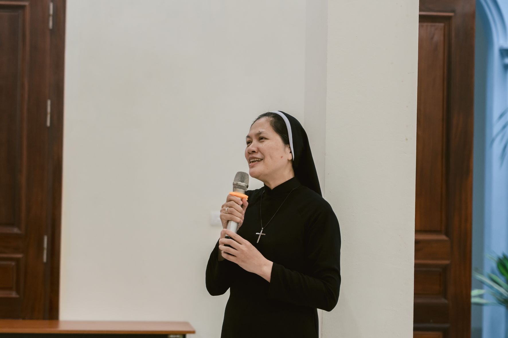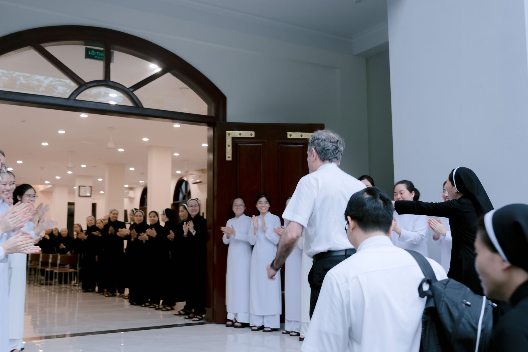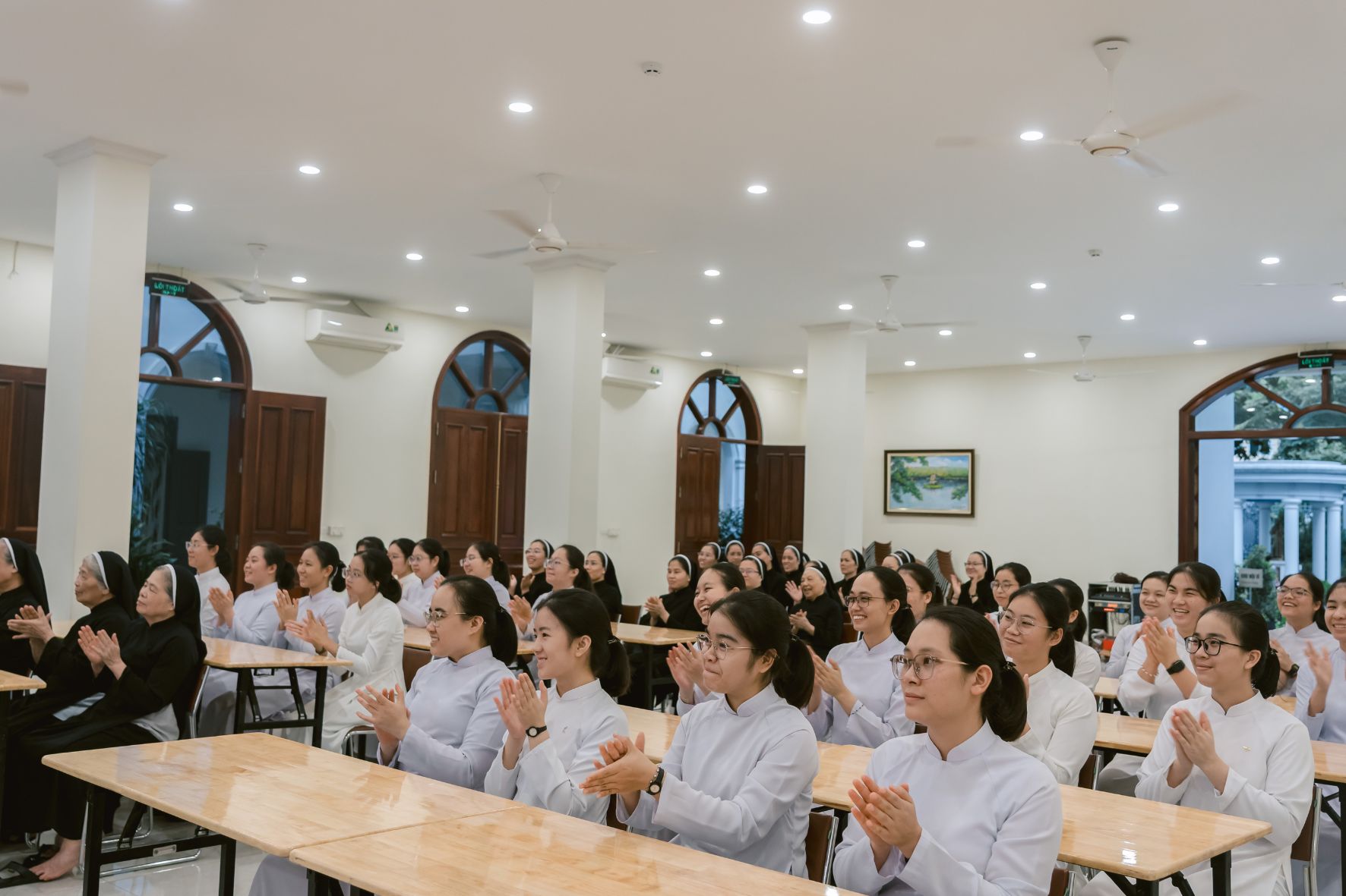 Thay mặt Hội dòng, sơ Ma-ri-a Trương Thị Mùi, Tổng Cố vấn, phụ trách Cộng đoàn Nhà Mẹ, đã dâng lời chào mừng và bày tỏ lòng tri ân sâu sắc tới Đức cha cùng quý cha đã dành thời gian quý báu đến thăm cộng đoàn. Dẫu chỉ diễn ra trong khoảng thời gian ngắn, cuộc gặp gỡ đã để lại những dấu ấn thiêng liêng, chan chứa tình hiệp thông và khơi dậy nhiệt huyết truyền giáo vượt qua mọi biên cương.