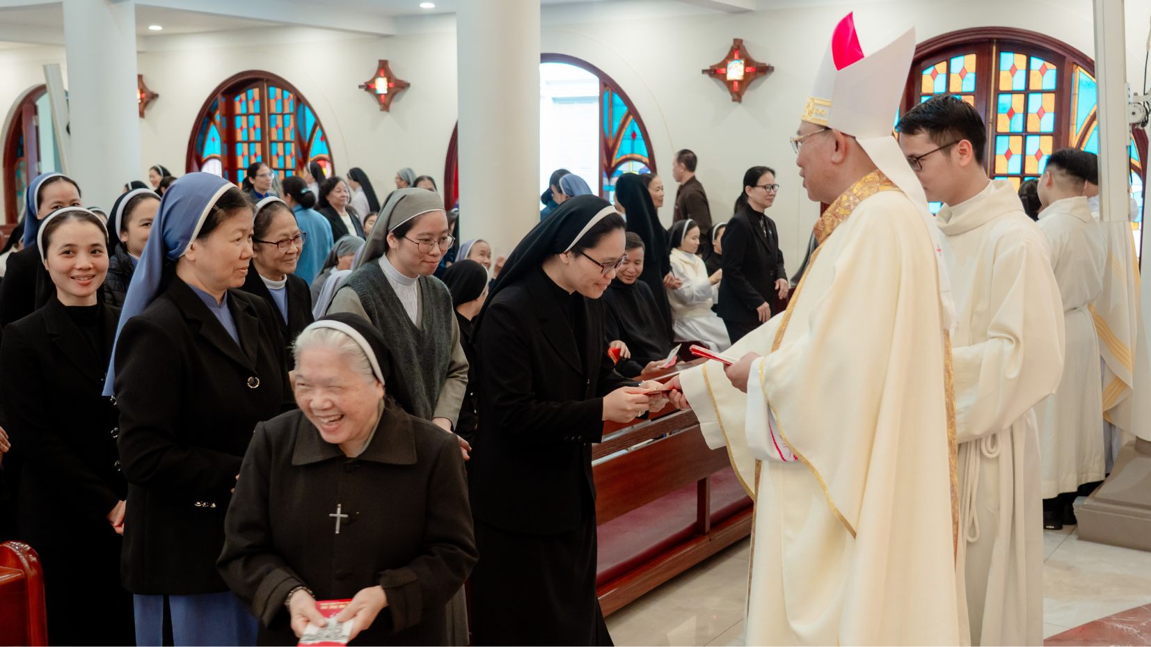 Đáp lời, Đức Tổng Giuse bày tỏ lòng cảm ơn chân thành đối với những hy sinh âm thầm và nỗ lực bền bỉ của quý tu sĩ, đồng thời khích lệ anh chị em tiếp tục trở nên ánh sáng và men muối giữa lòng Giáo Hội và xã hội. Trước khi kết thúc Thánh lễ, Ngài đã thân tình trao tặng lì xì đầu Xuân, như lời chúc lành và chúc mừng năm mới gửi đến toàn thể quý tu sĩ.