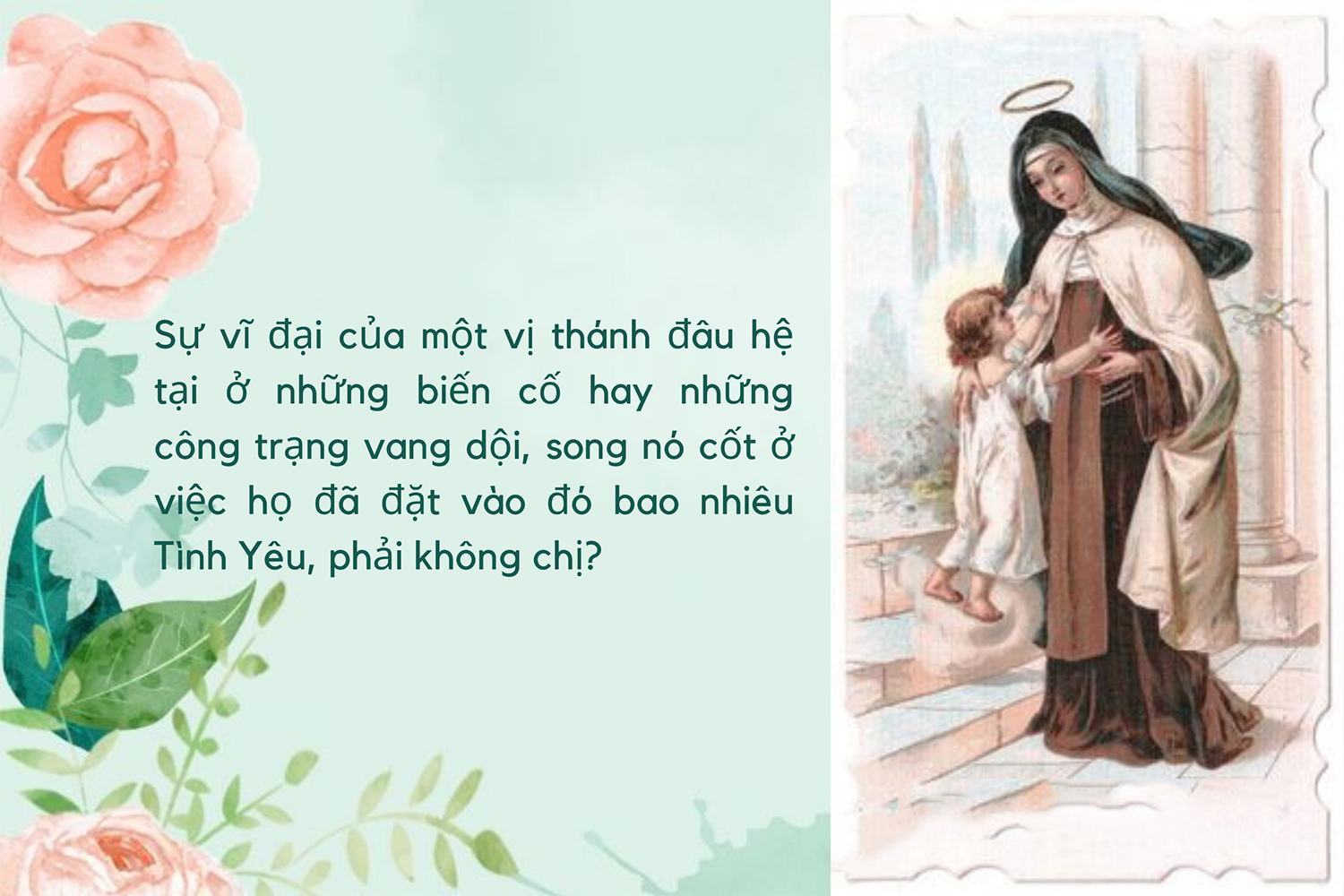 Chị biết không, khi đọc tiểu sử của chị đã có không ít người thắc mắc: “Tại sao Đức Thánh Giáo Hoàng Gio-an Phao-lô II lại tặng cho chị danh hiệu Tiến sĩ Hội Thánh? Điều gì đã khiến chị có được danh hiệu ấy?” Bởi cuộc đời của chị rất đỗi đơn giản và bình thường, chẳng có chi là nổi trội: 15 năm sống ở gia đình và chín năm rưỡi sống trong tu viện, dường như người ta không gặp thấy một công cuộc vĩ đại nào nơi chị. Chẳng hạn làm phép lạ như thánh Vinh Sơn, những cuộc xuất thần như thánh Tê-rê-sa Avila hay chịu những hình phạt như thánh Đa Minh, thánh Phan-xi-cô,… Thậm chí có người còn nhận xét: “Có lẽ với cuộc đời ấy chị đã chìm vào quên lãng, nếu không để lại cuốn tự thuật ‘Truyện một tâm hồn’ mà chị viết vì vâng phục.”
