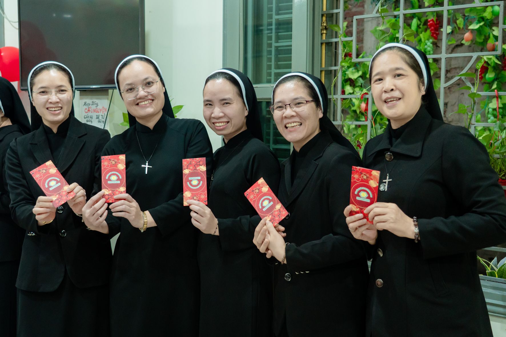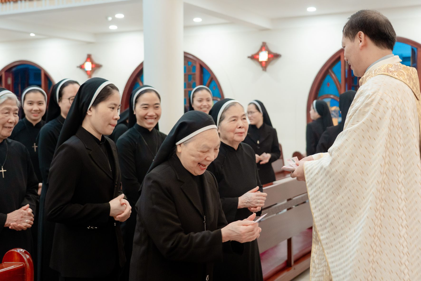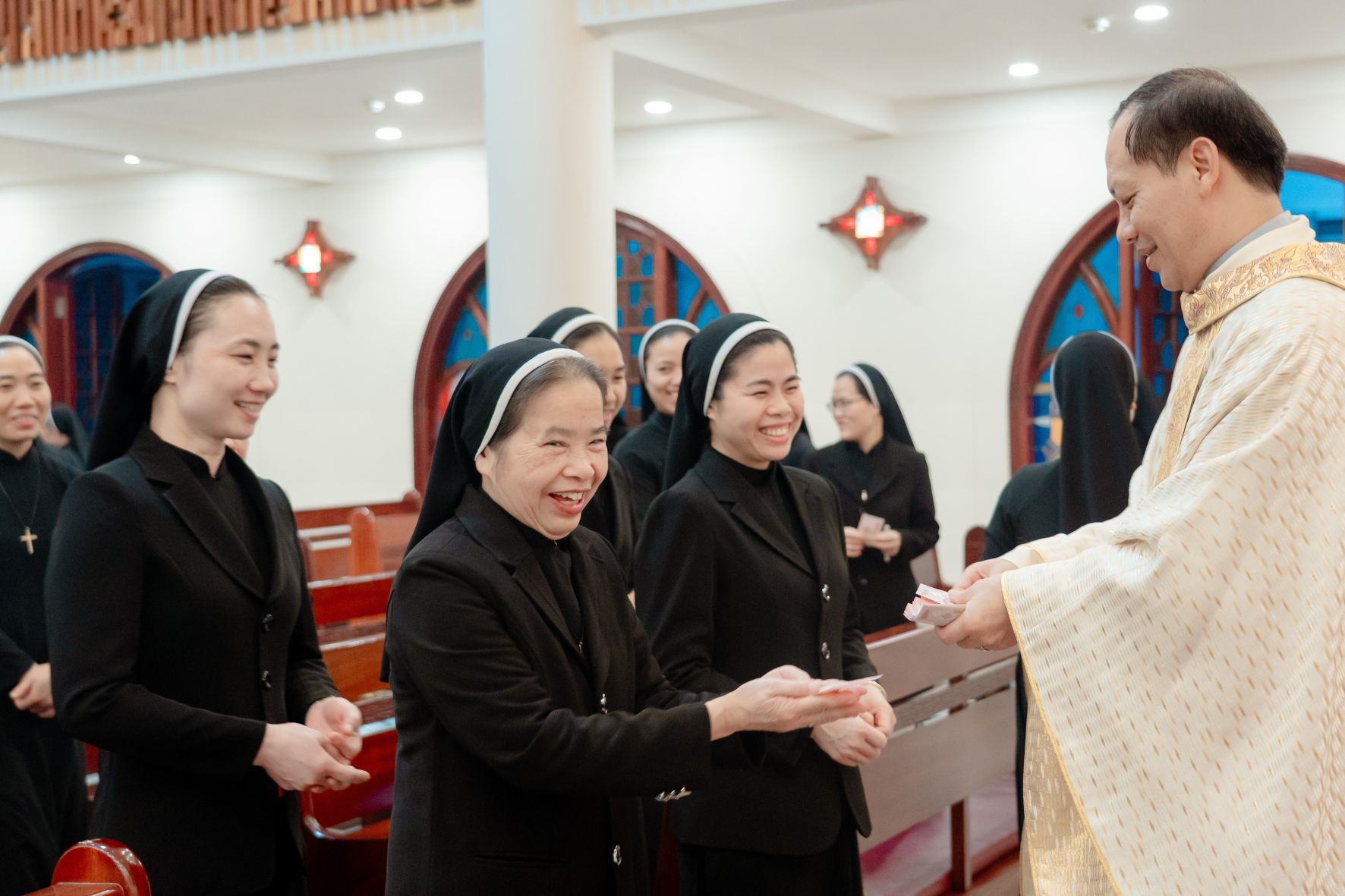 Ngay sau nghi thức ấy, trong bầu khí gia đình đậm đà nghĩa tình, Cha Tuyên Úy Giuse đã trao những bao lì xì đầu xuân đến từng chị em như lời chúc thân tình và dấu chỉ quan tâm mục tử. Món quà đơn sơ nhưng ấm áp ấy nối dài niềm vui phụng vụ, làm cho ngày đầu năm thêm trọn vẹn trong sự hiệp thông và yêu thương.