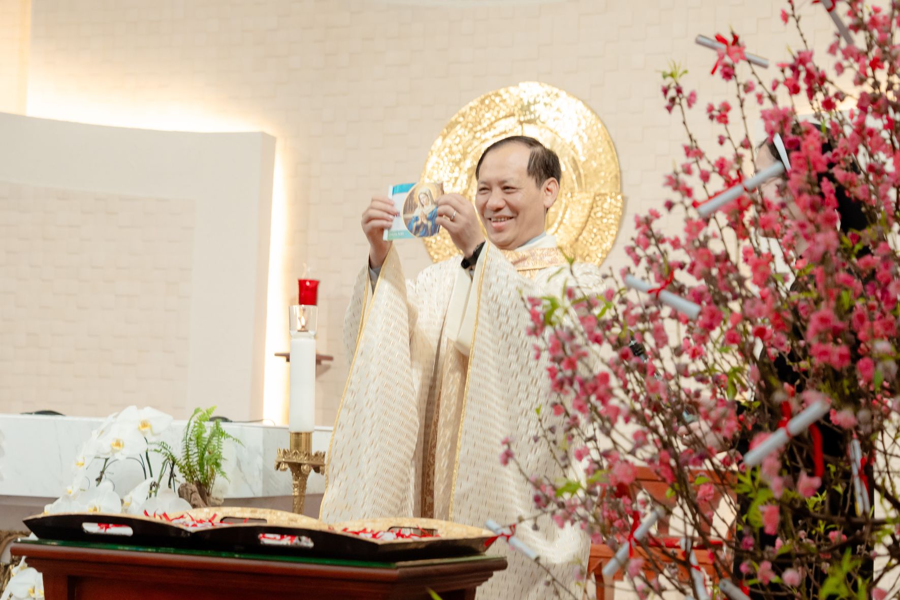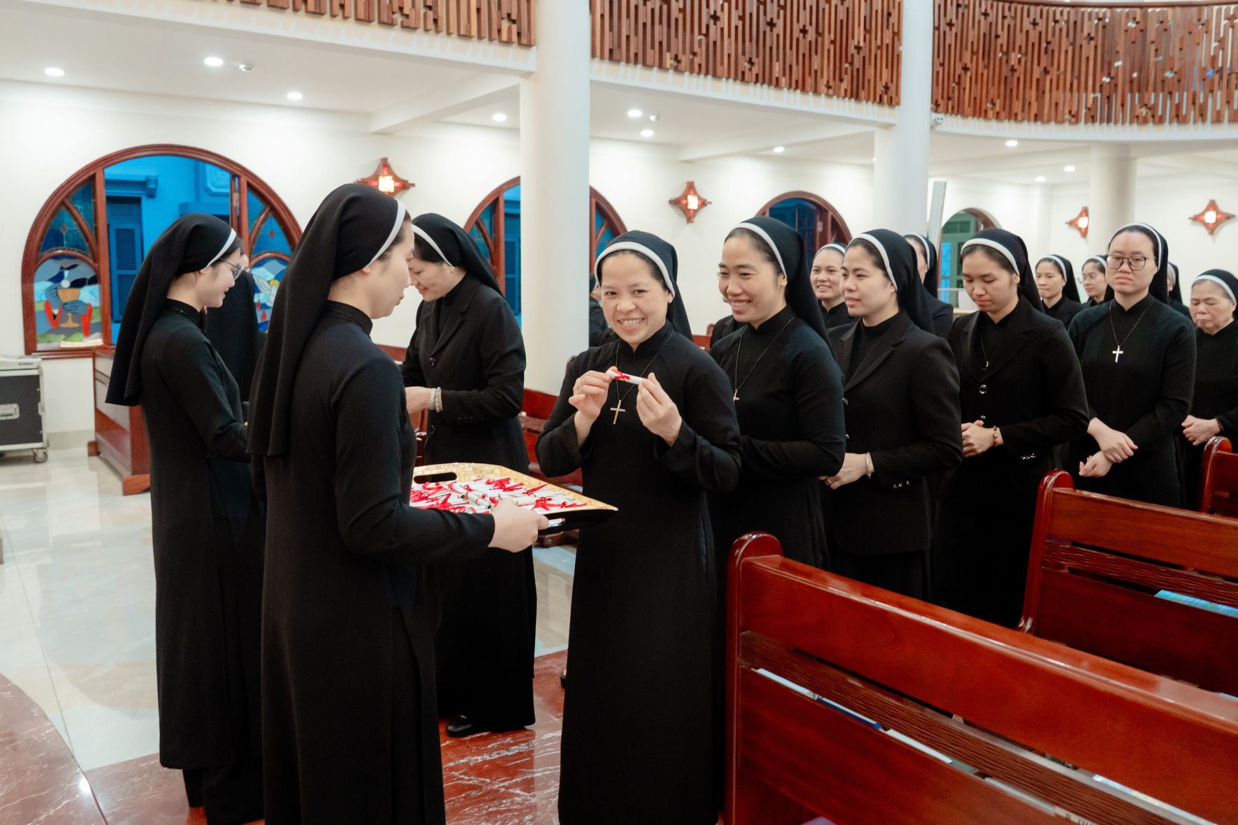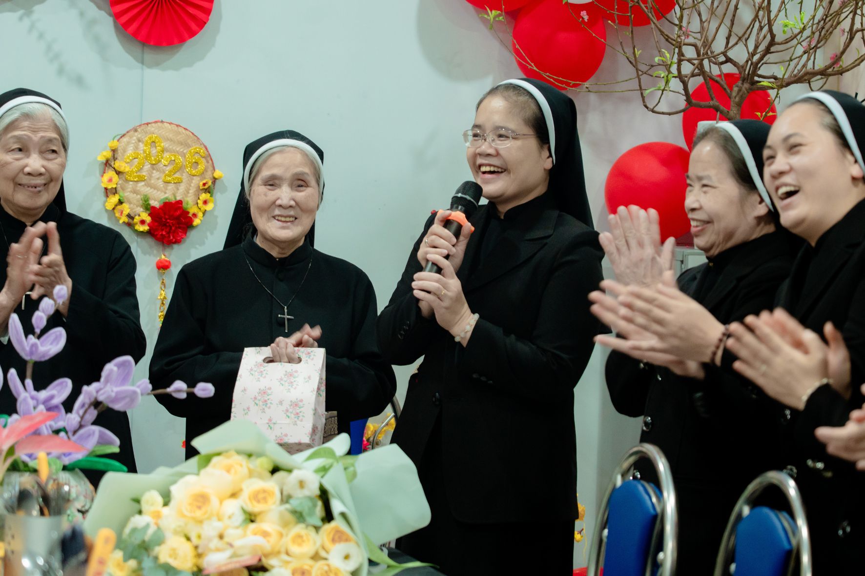 Ngay sau nghi thức ấy, trong bầu khí gia đình đậm đà nghĩa tình, Cha Tuyên Úy Giuse đã trao những bao lì xì đầu xuân đến từng chị em như lời chúc thân tình và dấu chỉ quan tâm mục tử. Món quà đơn sơ nhưng ấm áp ấy nối dài niềm vui phụng vụ, làm cho ngày đầu năm thêm trọn vẹn trong sự hiệp thông và yêu thương.