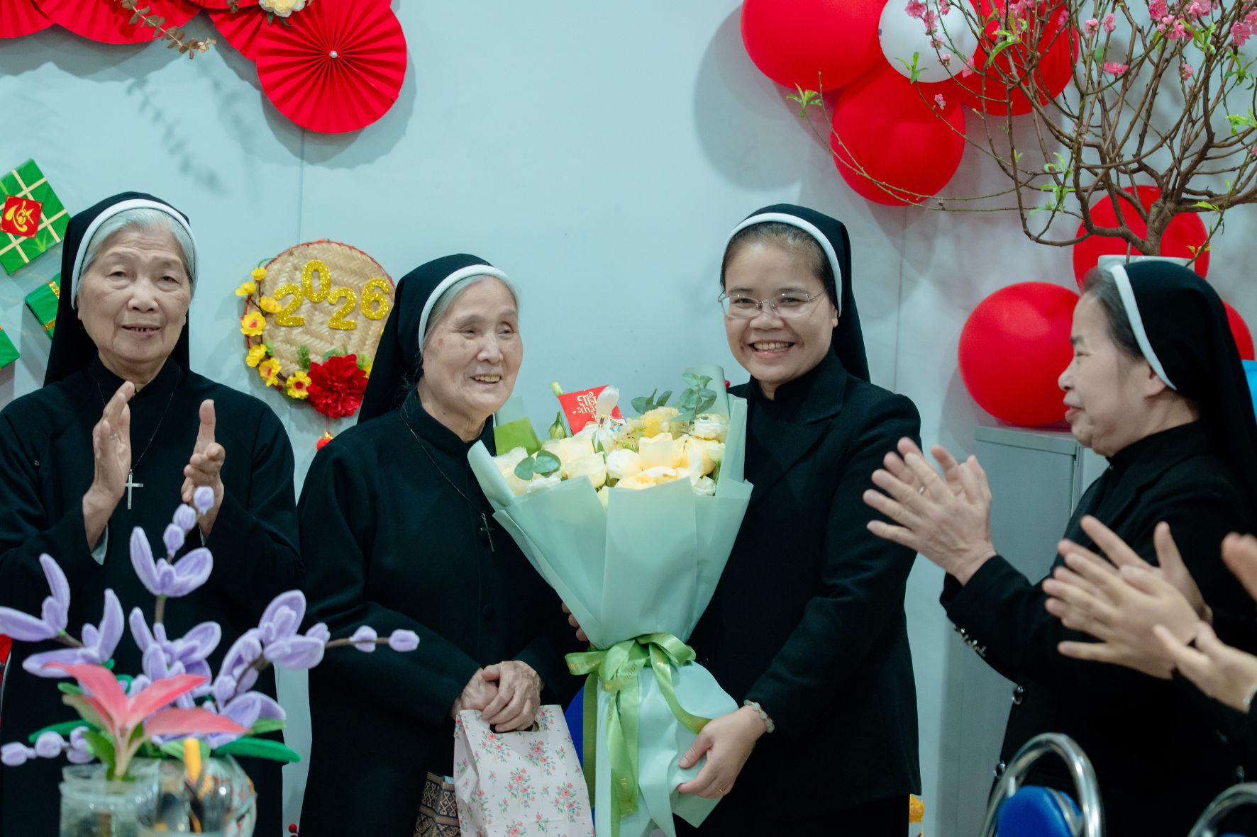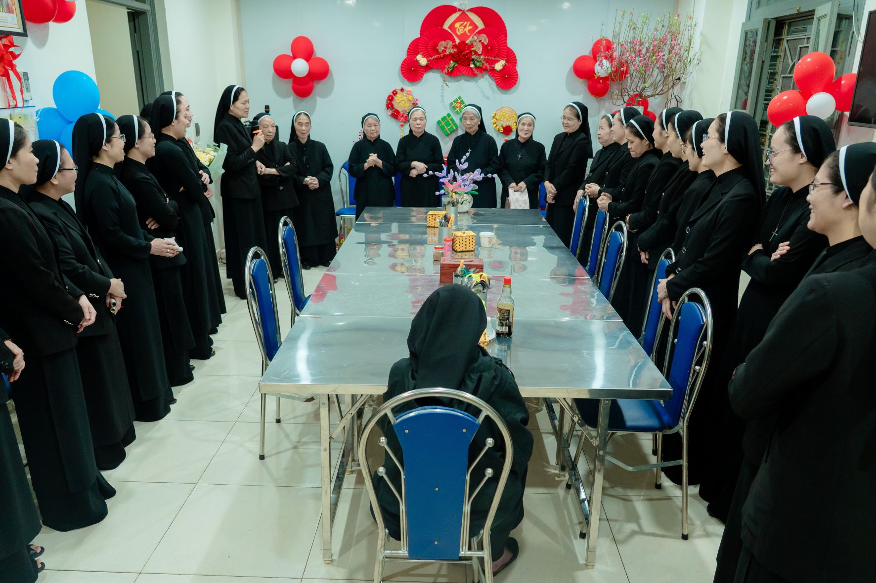 Sau Thánh lễ, chị em cùng quy tụ để chúc Tết Chị Tổng Phụ Trách, quý Bà và toàn thể chị em trong cộng đoàn. Những lời chúc đầu năm, những nụ cười và cái bắt tay thân ái không chỉ là nét đẹp truyền thống văn hóa, nhưng còn là dấu chỉ sống động của tình gia đình thiêng liêng trong cùng một ơn gọi.