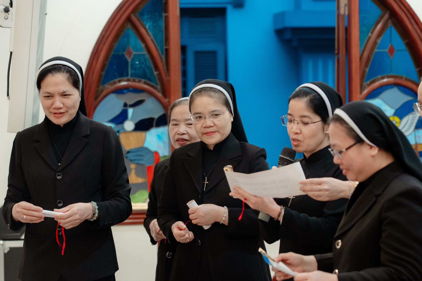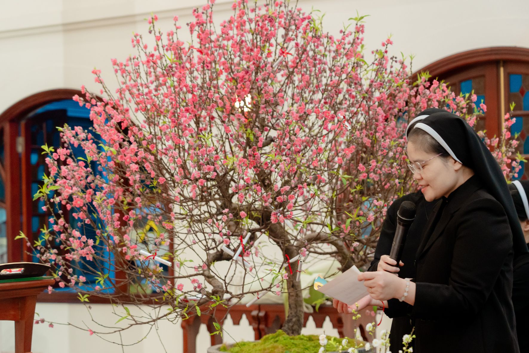 Tiếp đó, Chị Phụ trách Cộng đoàn Nhà Mẹ cũng tiến lên hái lộc Lời Chúa cho cộng đoàn, xin ơn bình an và hiệp nhất cho đời sống chung. Sau đó đại diện các khối lên và từng chị em lần lượt lên đón nhận lộc Lời Chúa cho riêng mình. Mỗi câu Kinh Thánh trở thành một lời nhắn gửi cá vị, một lời hứa và cũng là lời mời gọi sống trung tín hơn trong năm mới.
