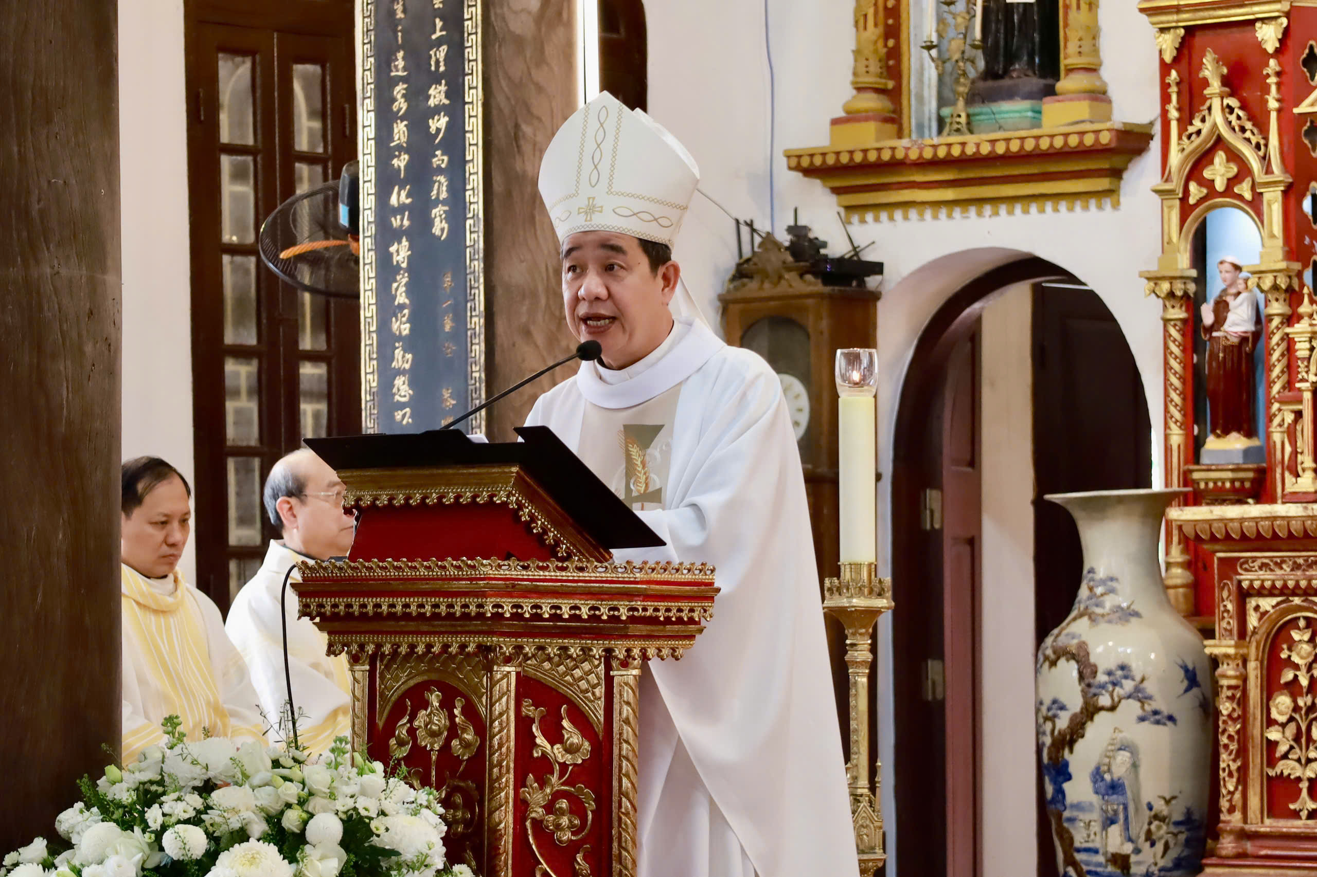 Trong bài chia sẻ Lời Chúa, Đức Cha Đa Minh đã mời gọi cộng đoàn cùng chiêm ngắm vẻ đẹp của ơn gọi thánh hiến. Mỗi người được Thiên Chúa gọi bằng những con đường khác nhau, với những câu chuyện và hành trình riêng biệt; nhưng tất cả đều khởi đi từ huyền nhiệm của tình yêu Thiên Chúa. Chính Ngài là Đấng khơi lên trong tâm hồn người được gọi một ước muốn sâu xa bước theo Đức Kitô và hiến trọn đời mình cho Thiên Chúa. Người được gọi đáp lại lời mời gọi ấy bằng tiếng “Xin vâng”, dấn thân bước vào đời sống thánh hiến để phụng sự Thiên Chúa và phục vụ Hội Thánh. Hai nữ tu hôm nay mừng Ngân khánh khấn dòng cũng đã quảng đại thưa lên tiếng “Xin vâng” trước lời mời gọi nhiệm mầu của Thiên Chúa.