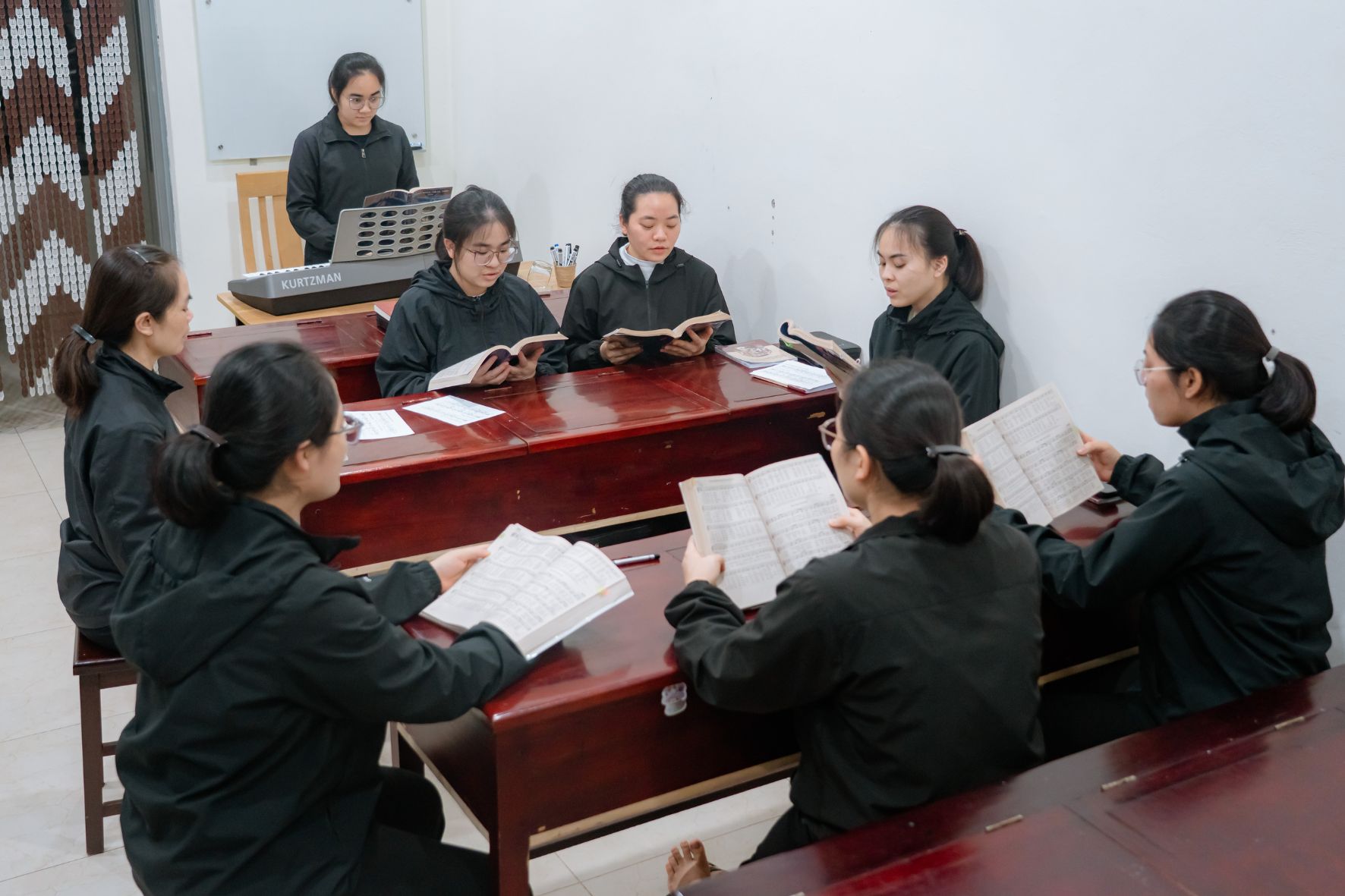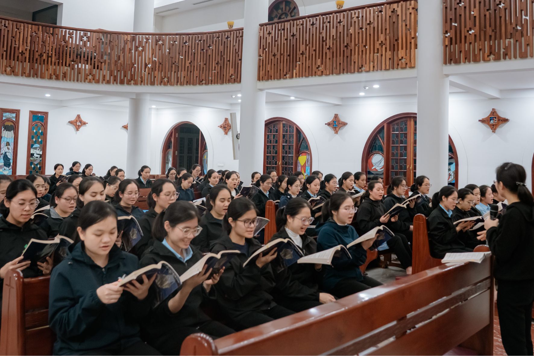 Để Thánh lễ Tiếng Anh được cử hành cách xứng hợp và sốt sắng, trong suốt hai năm qua, chị em trong cộng đoàn đã kiên trì tập hát, luyện đọc Lời Chúa và chuẩn bị phụng vụ bằng tiếng Anh theo định kỳ mỗi tháng. Từ những buổi tập riêng theo từng khối đến các buổi ghép hát chung, tiến trình chuẩn bị ấy không chỉ giúp trau dồi khả năng ngôn ngữ, mà còn trở thành hành trình đào sâu đời sống nội tâm và mở rộng tâm hồn hướng về Hội Thánh hoàn vũ.