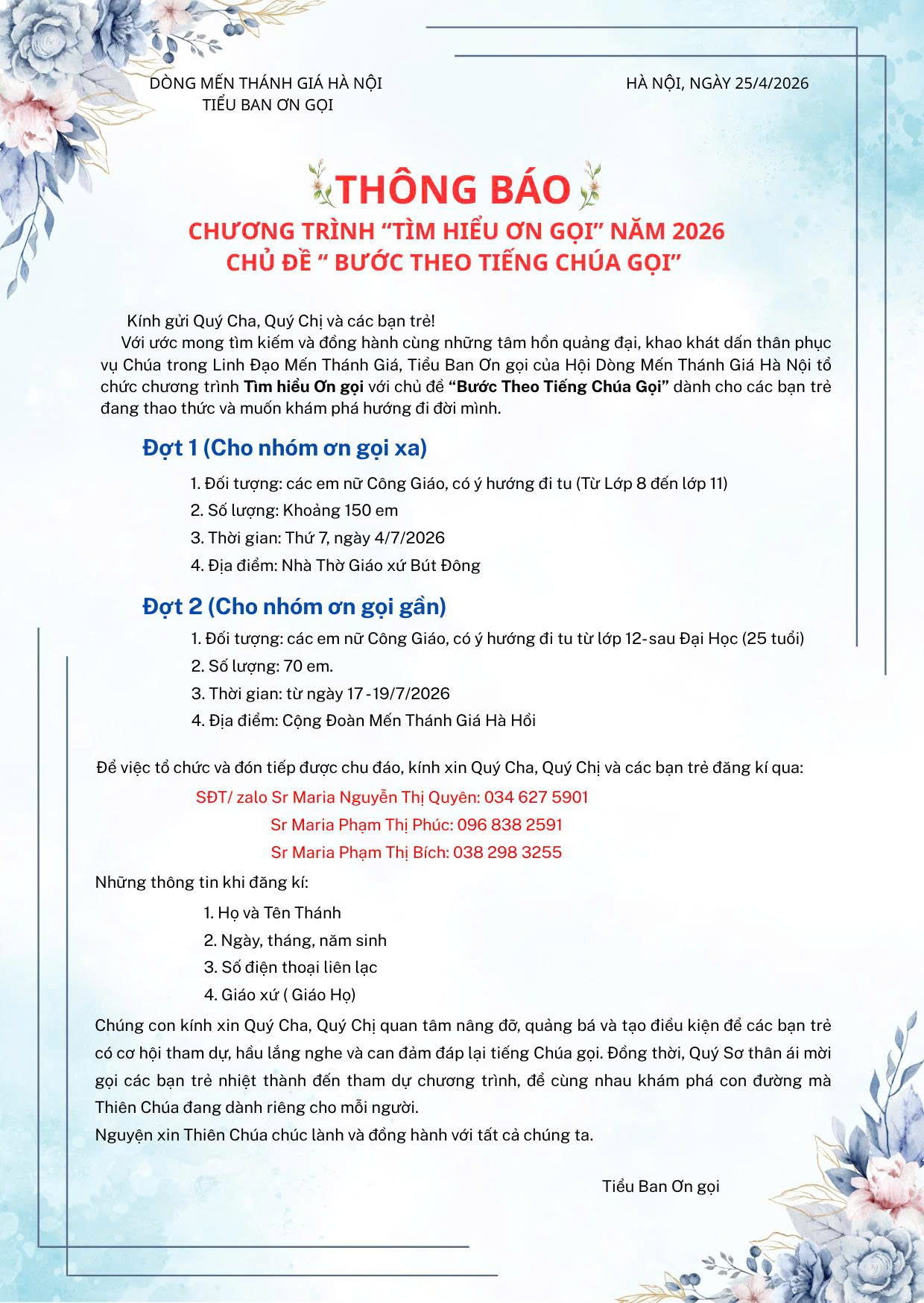 Trang chủ > Thông báo chương trình: Tìm Hiểu Ơn Gọi Năm 2026 – Dòng Mến Thánh Giá Hà Nội