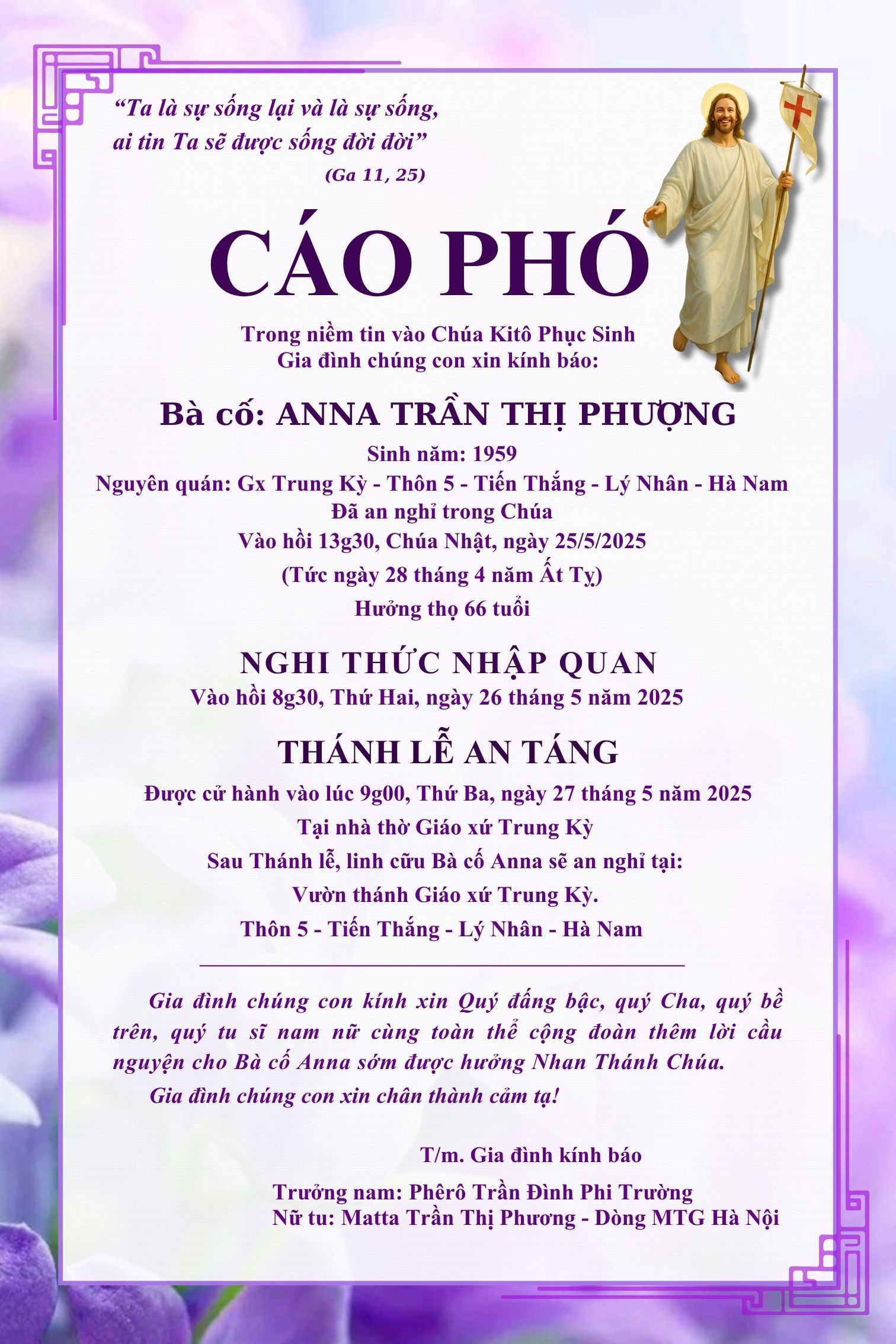 Cáo phó: Bà cố An-na Trần Thị Phượng – Thân mẫu nữ tu Mat-ta Trần Thị Phương – Dòng MTG Hà Nội