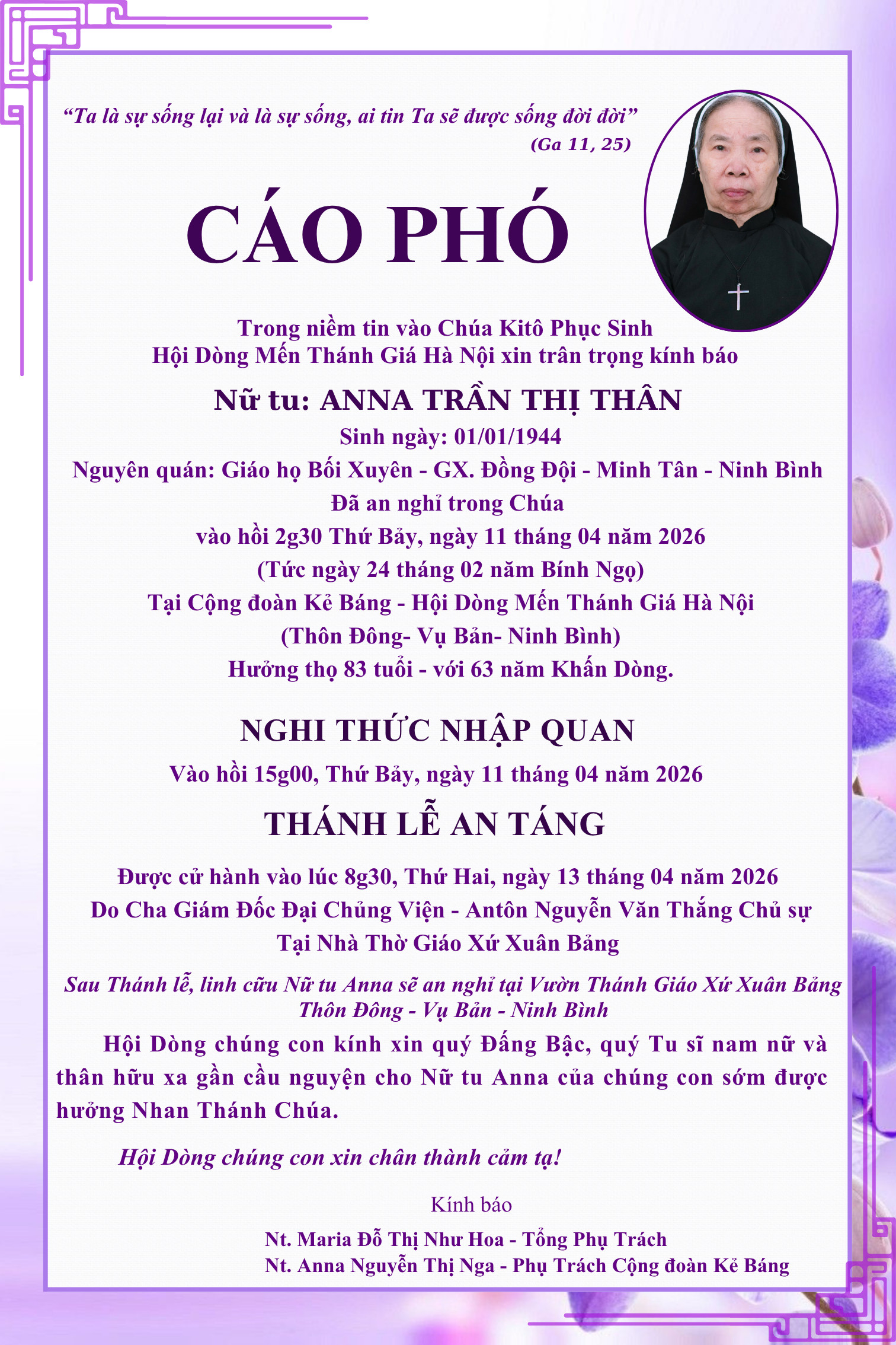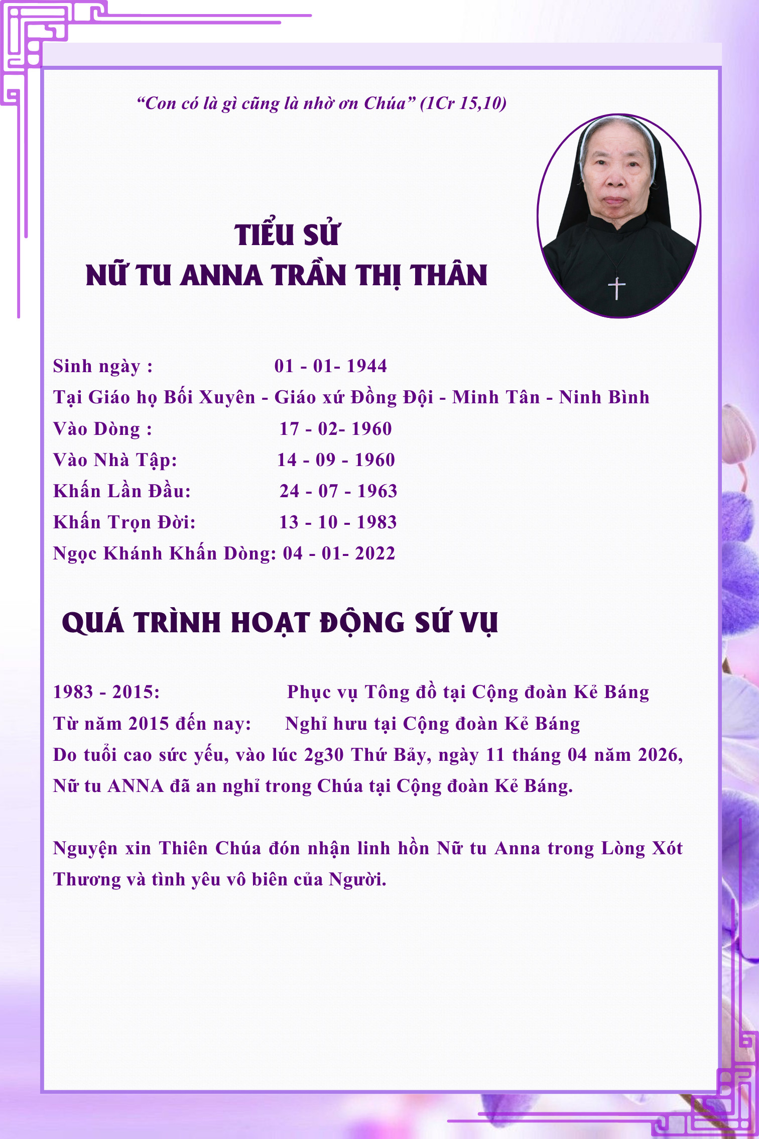 Cáo phó: Nữ Tu Anna Trần Thị Thân