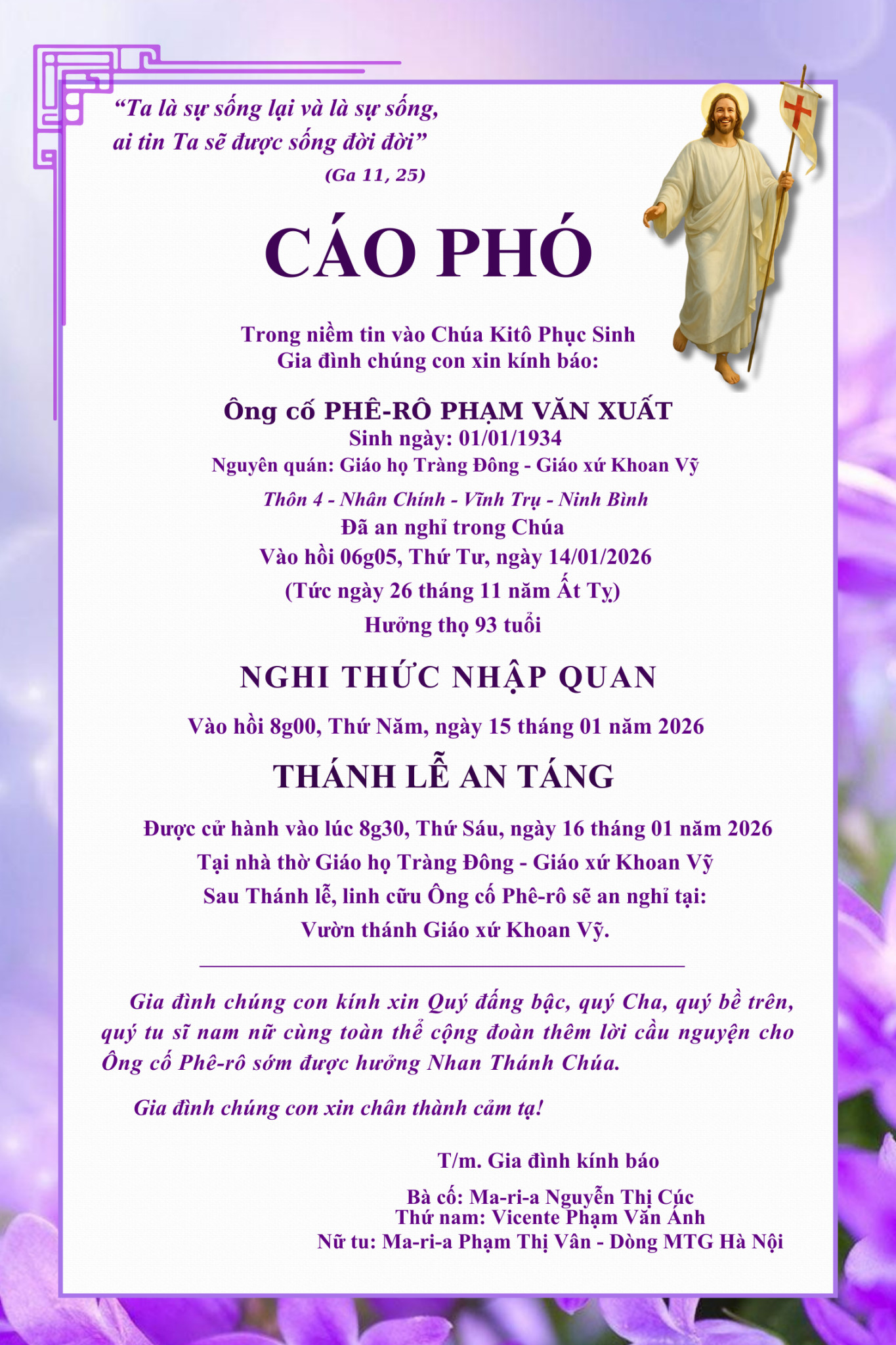 Cáo phó: Ông cố Phê-rô Phạm Văn Xuất – thân phụ nữ tu Ma-ri-a Phạm Thị Vân – Dòng Mến Thánh Giá Hà Nội